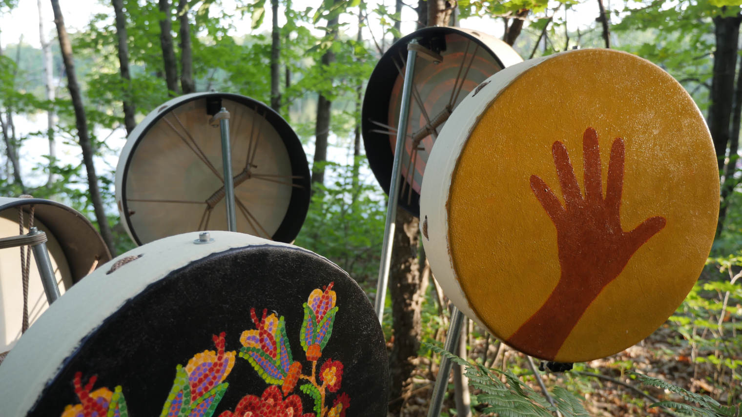 Heart Band is an interactive sound installation in which the sounds of twelve painted hand drums are activated by the motion of visitors. Each drum plays back recordings of David Garneau’s heart beat, its intensity and volume increasing and decreasing in relation to the visitor’s proximity to the drum. The visitors’ movements around the drums creates a unique composition which is heard as the phasing polyrythms of Garneau’s heartbeat emanating from the painted surfaces themselves. Ideally, the drums will be thought of as a spatially triggered ensemble of instruments played by their visitors in a gallery setting or by dancers in the context of a concert performance.
