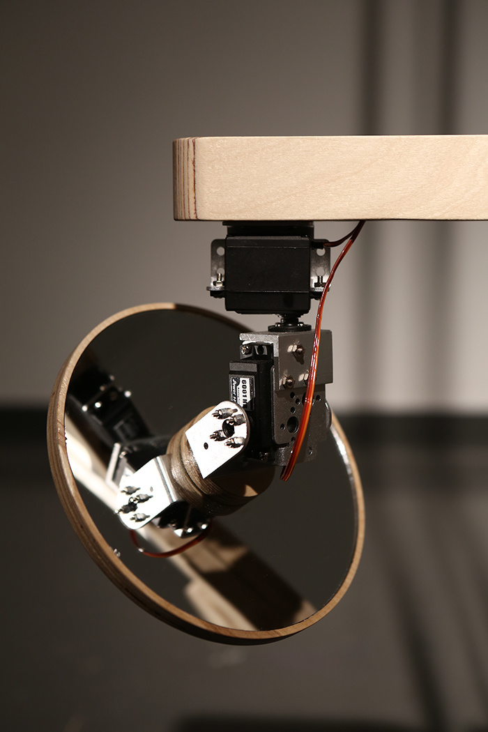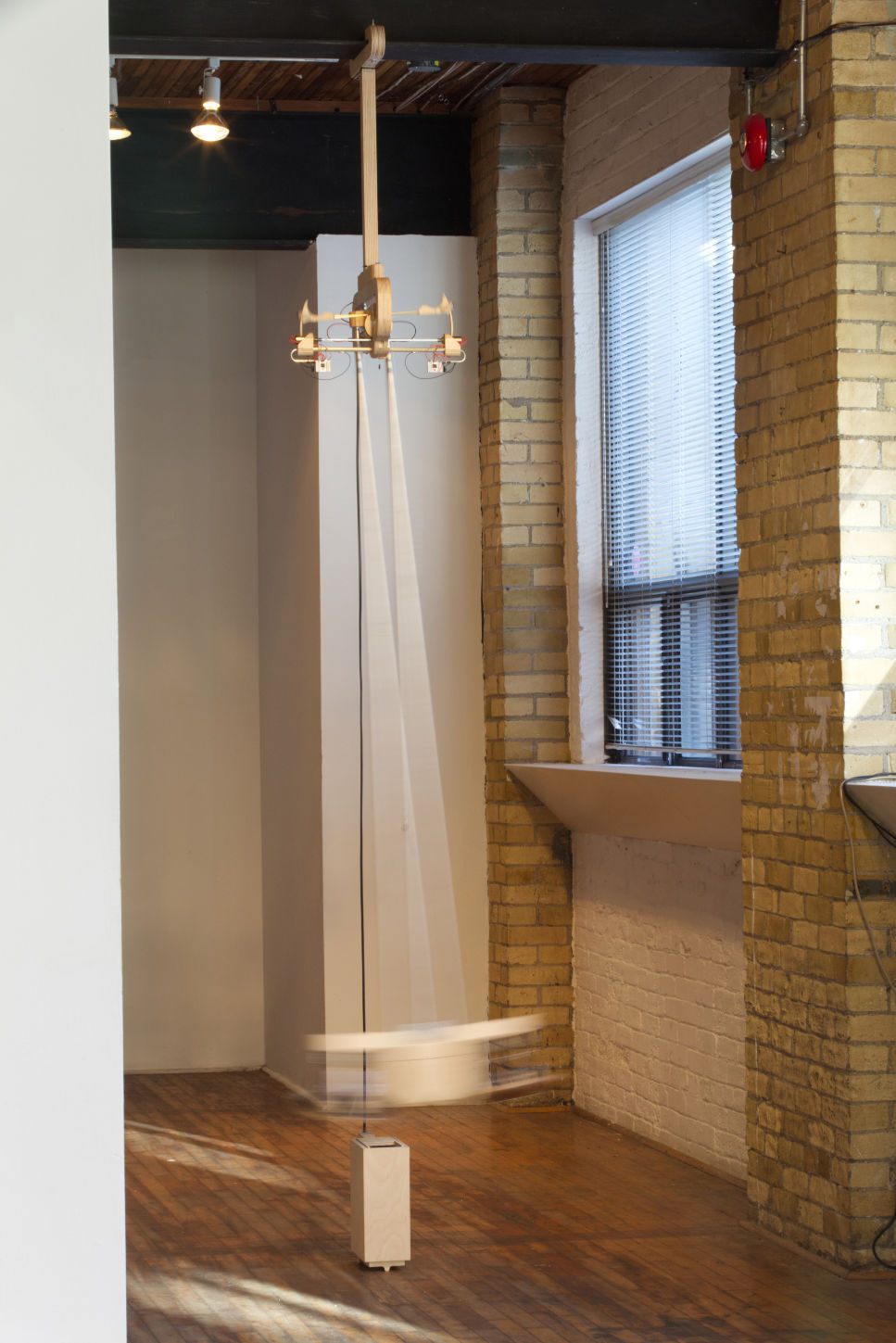 The Sound That Severs Now from Now employs its large pendulum swinging in time as a visual/ sculptural means of mechanically diffusing a beam of sound around the exhibition space to allow one to experience a new way of hearing which is more akin to a passing object making sound than it is to a sound radiating from a central source.