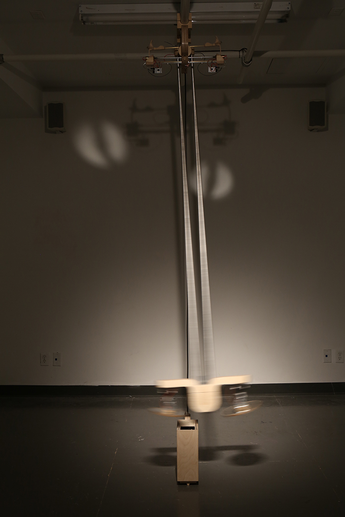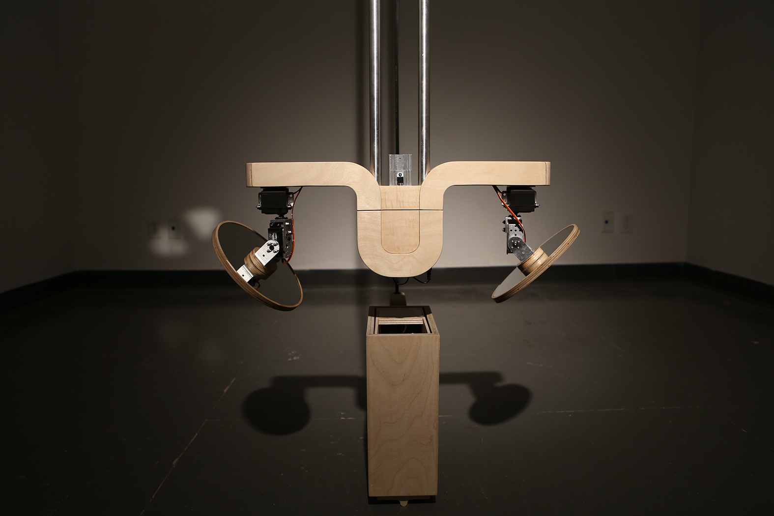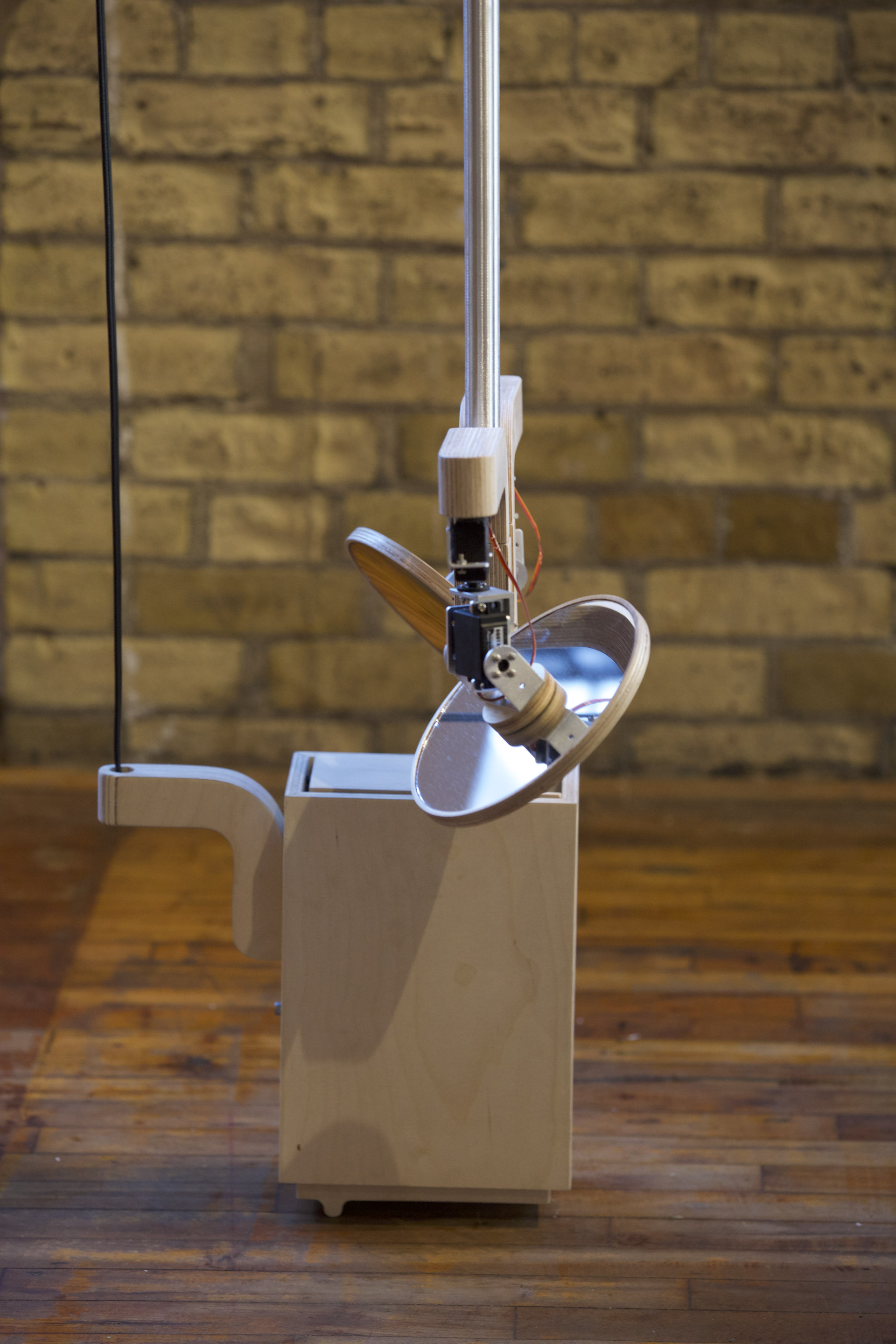 Stemming from ideas elucidated in Bruno Latour’s Facing Gaia: Six Lectures on the Political Theology of Nature (2013,) this work proposes a critique aimed at global political inaction in the face of climate change. This sculptural and sound-based work is premised upon friction created between a ground consisting of the slow ticking of time, and a beam of sound sonically punctuating the space. This sound of the ticking pendulum–this historical anthem of rational positivism–meting out time as regular commodified packets, provides the means by which this pendulum can supply both a central visual point of focus and apt point of cultural reference, setting the stage for a symbolic juxtaposition, against which the second part of the work is balanced. This second part – in the form of a quietly destabilizing sonic figure that carries the sound of melting Greenland ice layered with whisperings of scientists on both sides of the climate argument, proposes a subversion that calls into question the objective historical pride and increasingly apparent eco-folly represented by such devices and debates as they slice, measure and render the world, serving it up to the utility-maximizing calculus of human appetite….